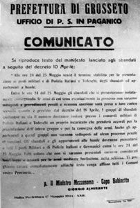 Nell’estate del 1971 alcuni storici dell`Università di Pisa rinvennero negli archivi del comune di Massa Marittima la copia anastatica di un manifesto diffuso in provincia di Grosseto nel maggio 1944 con il quale il governo della Repubblica Sociale Italiana annunciava che i renitenti alla leva e i disertori sarebbero stati condannati a morte mediante fucilazione. Il manifesto era firmato da Giorgio Almirante nella sua veste di funzionario del ministero della Cultura Popolare e venne pubblicato il 27 giugno 1971 dal quotidiano l`Unità col titolo: “Un servo dei Nazisti. Come Almirante collaborava con gli occupanti tedeschi”. Alcuni giorni dopo lo pubblicò anche Il Manifesto.